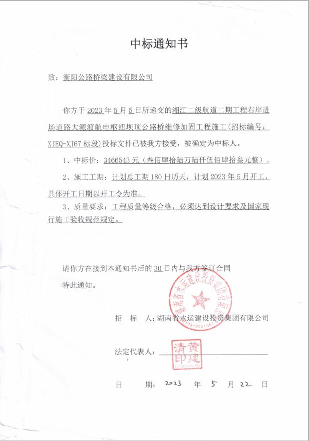 湘江二级航道二期工程右岸进场道路大源渡航电枢纽坝顶公路桥维修加固工程中标结果公示